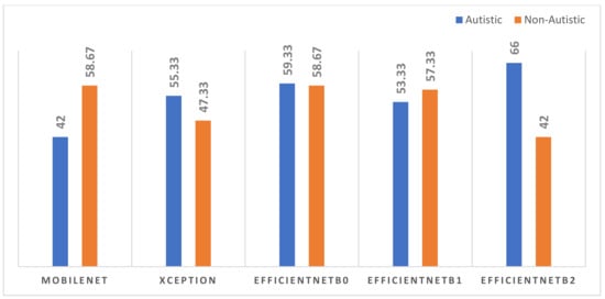 The models yielded a prediction rate for each case, which indicates the probability that each child will be classified as autistic or not. On the 300 test data samples, Table 3 shows the prediction rates of the five models (only five records from each class are included in Table 3). We devised a new scoring method for autistic and TD children based on class probabilities with a threshold of 95%. According to the scoring methods, if a model’s prediction meets the threshold, it receives one point. A comparison of model performance based on the new scoring is shown in Figure 13. The EfficientNetB0 showcased consistent scores of 59.33% for autistic class and 58.67% for TD class.