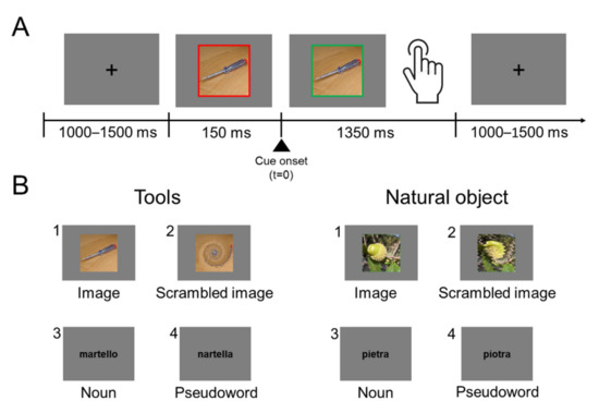 Experimental procedure. (A) Task timing: Participants were asked to fixate the center of the screen placed in front of them. Each trial started with the presentation of the stimulus surrounded by a red frame. After 150 ms the frame turned green and the participants were allowed to respond. Participants were instructed to respond only if the stimulus referred to a real tool or to a real natural graspable object. The trial ended when participants provided their responses or after 1350 ms if no response was given. (B) Stimuli examples: images (1), scrambled images (2), nouns (3) and pseudowords (4).