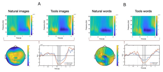 The typical time-frequency pattern was observed in every subject and condition consisting in beta band desynchronization over the contralateral motor area immediately after stimulus onset followed by focal synchronization after movement execution. When comparing natural graspable objects and tools (both for images and nouns), statistical analysis revealed a significant difference in the interval between 0.5 and 1 s after stimulus onset in contralateral motor area. Specifically, a significant greater desynchronization was found for tools stimuli with respect to natural stimuli (Figure 2A,B). The difference was greater and more protracted in the case of visual stimuli as compared to nouns (Figure 2, bottom panels). No significant differences were found in the remaining comparison (natural object images vs. nouns, tool images vs. nouns).