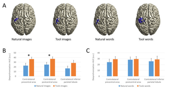(A): Source analysis of beta activity. Source estimation projected onto the MNI template brain of grand-averaged power modulation obtained by contrasting −1.5 to −0.5 s vs. 0.5 to 1.5 s with respect to the cue onset in 15–25 Hz band for each condition. For illustrative purpose, only values greater than 80% of the maximum are shown. (B,C): Beta desynchronization AUC. Beta AUC values for natural and tools images (B) and nouns (C) condition. Note that the natural stimuli values are smaller than tools stimuli in both images and nouns condition in all areas, confirming the main effect of Category. Asterisk indicates significant difference in t-tests. Data are represented as mean±.