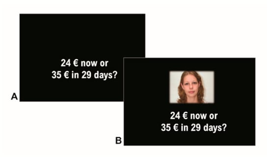 In one task, participants’ temporal discounting behavior was assessed by using the extensively validated and commonly used 27-item MCQ—Monetary Choice Questionnaire []. In the MCQ, on each item, participants chose between immediate, smaller rewards (e.g., €25 today) and delayed, larger rewards (e.g., €35 in 25 days) of three differing magnitudes (9 small rewards, 9 medium, and 9 large).