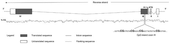 PCR products were then verified by agarose electrophoresis. The sequencing was performed on a PyroMark Q24 ID using Pyro Mark Gold reagents (Qiagen, Hilden, Germany), after immobilizing PCR products to Streptavidin Sepharose High-Performance (GE Healthcare, Chicago, IL, USA) beads via biotin affinity and denatured to allow the annealing with the sequencing primers. Within the CpG island depicted in Figure 2, we chose to analyze the percentage of DNA methylation of 4 CpG sites. The methylation’s level was analyzed through the PyroMark Q24 ID version 1.0.9 software which calculates the methylation percentage mC/(mC + C) (mC = methylated cytosine, C = unmethylated cytosine) for each CpG site, allowing quantitative comparisons.