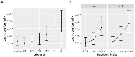 The model uses treatment coding for factors, with the baseline set as the reference value, so each coefficient of the model can be used to test the change in k due to each proposer. We apply the t as z criterion for significance of the coefficients, so t values higher than two can be considered significant. Even though this method has been shown to be anti-conservative, this mostly applies to much smaller sample sizes []. As reported in Table 1, both untrustworthy proposers and the male neutral proposer elicit a significant increase in discounting rate; therefore, compared to the baseline condition participants, they show less willingness to wait. The estimated marginal means of the back-transformed k values are plotted in Figure 3A.