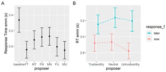 A second analysis is carried out on response times. On average, response times in seconds (s) in this task are 2.88 (SD = 1.84) s, 3.11 (1.68) s without a face, and 2.84 (1.62) s with a face. We use a generalized mixed effect model with family set to inverse Gaussian and identity link functions. This allows us to consider the skewed distribution that is typical of response times without the need to transform the variable []. We use the current proposer as the fixed effect with the baseline set as the reference level and we allow the random intercept to vary for each subject. Again, each coefficient tells us the difference between the baseline condition (with no proposer) and the other conditions. Each coefficient is significant and negative, meaning that when a proposer is present, participants take less time to decide compared to the baseline condition (see Table 3 and Figure 4A).