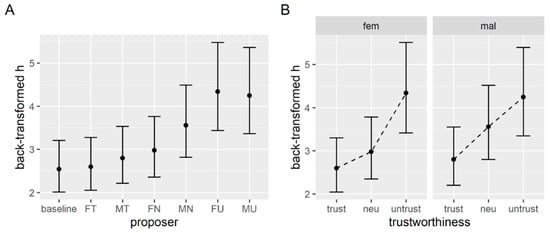 (A) Estimated marginal means of h parameters from the first model comparing baseline and each experimental condition. (B) Estimated marginal means of h parameters for each level of trustworthiness, with female (left) and male (right) proposers.