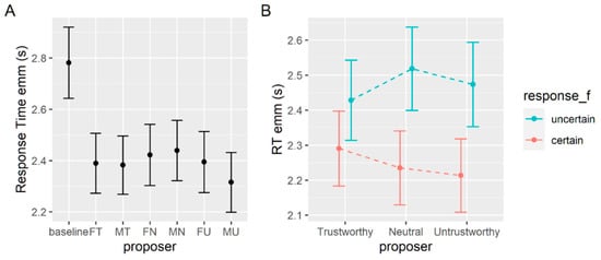 (A) Estimated marginal means of response times in seconds for the baseline and each experimental condition in the probabilistic discounting task. (B) Estimated marginal means of response times for each level of trustworthiness when the preference was for the certain (red) or uncertain (blue) options.