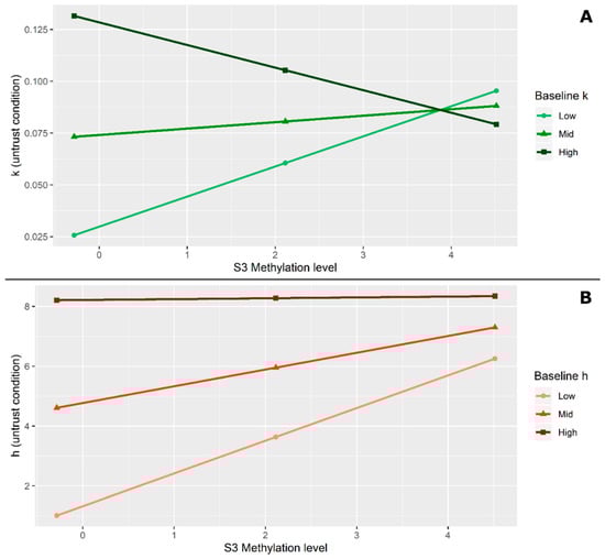 (A) Effect of the moderator (baseline k) on the relationship between site 3 methylation level and k in the untrustworthy condition. (B) Effect of the moderator (h baseline) on the relationship between site 3 methylation level and h in the untrustworthy condition.