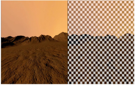 Left: virtual scene of a Martian environment (VR). Right: the virtual Martian scene with the optokinetic stimulation shading layer superimposed (VR + DOS).