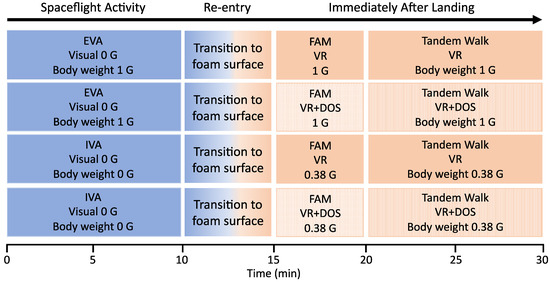 Diagram showing the conditions during the four test sessions. First, the subjects performed extra- or intra-vehicular activities (EVA, IVA) while visualizing the ISS in virtual reality (Visual 0 G) with the body unloaded 0% (1 G) or 100% (0 G). Second, the subjects transitioned to a foam surface, and body unloading simulated the terrestrial (1 G) or Martian (0.38 G) gravitational field. Third, the subjects were familiarized (FAM) with the visual environment and the body unloading conditions. Fourth, the subjects performed the tandem walking test in four conditions: 1 G in VR; 1 G in VR + DOS; 0.38 G in VR; 0.38 G in VR + DOS. The order of sessions was randomized across subjects.
