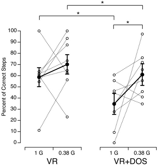 One subject in ARGOS was unable to bring their legs close enough together to walk heel-to-toe. The feet of another subject were not visible in the recorded video. Thus, we were unable to assess tandem walk performance for two subjects in 0.38 G and VR. For the remaining eight subjects, repeated-measures analysis of variance (ANOVA) and post hoc t-tests were used to compare the percent of correct steps between VR and VR + DOS in 1 G and 0.38 G.