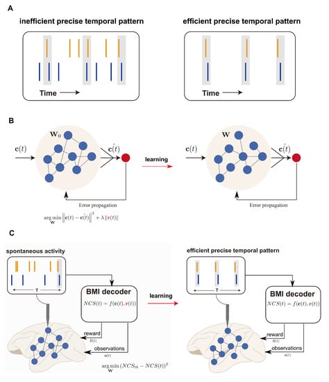 26]. Thus, BMI endowed us with the ability to define “objectives”, namely to constrain the emission of spikes in order to investigate whether the efficient temporal patterns could be reproducibly generated and learned (