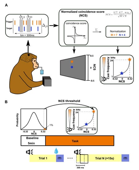 In this task, the spikes of the trigger unit and the target unit in a window of 300 ms were streamed in real time to custom-written scripts in MATLAB (Mathworks Inc., Natick, MA, USA) in order to compute a conditioning variable: the normalized coincidence score (NCS). The window was slid every 150 ms with a 150 ms overlap. NCS was then fed back to the subject aurally and visually, every 150 ms as well. The subjects would receive the water reward if they managed modulate the neural patterns to drive the NCS to the threshold in 15 s. Otherwise, the trial would be terminated, and the subjects would have to wait for another 4 s to initiate the next trial (