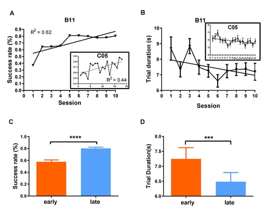 Figure 3A). By further designating the first four sessions as the early phase of learning and the last four as the late phase, we observed marked improvements from the early to the late phase (