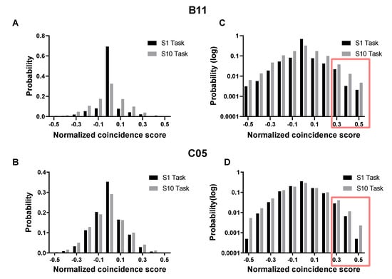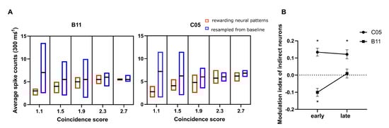 Additionally, we also compared the spike counts of the precise temporal patterns collected from this task with those from the rewarding neural patterns of the CS-modulation task. Similarly, we sampled the neural patterns from these two sets so that the range of coincidence scores would match.