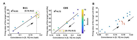 Figure 5A). In the vicinity of the peak, pronounced troughs were shown, which suggests that temporal precision had been achieved with efficiency rather than via hit-and-miss. Furthermore, since the coincidence score decayed exponentially with increased relative spike timing in the STDP function, the subjects were expected to generate finer temporal patterns (≤5 ms) to improve the chances of obtaining rewards. By narrowing the bin width of the CCHs to 5 ms, we found that the target units indeed fired more compactly with the trigger units than what could be inferred from the coarser CCHs mentioned above (