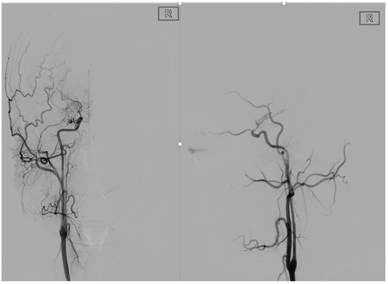(A,B) is a 9-year-old female with a right-sided external carotid arteriogram showing compensatory blood supply from the right middle meningeal artery to the cranial area.