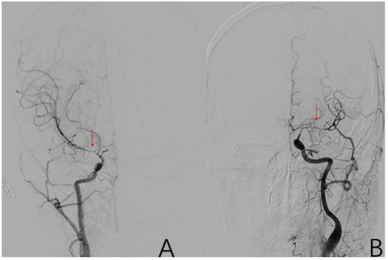 (A) is a 45-year-old female. This is a DSA image of his right common carotid artery. (B) is a 48-year-old male. This is a DSA image of his left common carotid artery. The red arrows show the location of M1 stenosis.