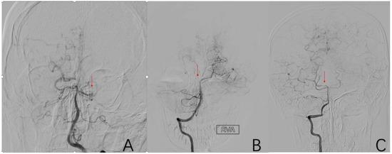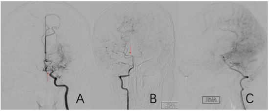 (A) is a 54-year-old male who had left A1 stenosis while supplying the right anterior cerebral artery A2 and distal branches vicariously through the anterior communicating artery. (B,C) are the same 8-year-old male. He had localized stenosis of the right P1 and a compensatory blood supply from the right posterior cerebral artery to the anterior cerebral artery and middle cerebral artery. The red arrow in (A) shows the location of A1 stenosis. The red arrow in (B) shows the location of P1 stenosis.