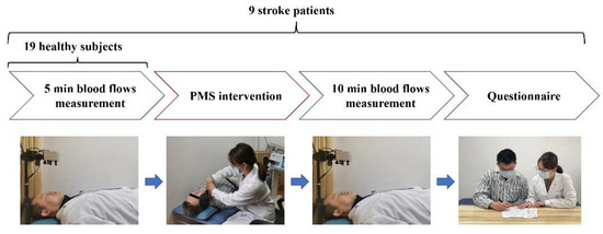 All the participants, including the healthy subjects and stroke patients, received the facial skin blood flow measurement. The healthy subjects received five minutes of facial blood flow measurement and did not take PMS intervention. Stroke patients sequentially underwent a 5-min pre-intervention blood flow measurement and a 10-min post-intervention blood flow measurement. Figure 1 presents the experimental setup.
