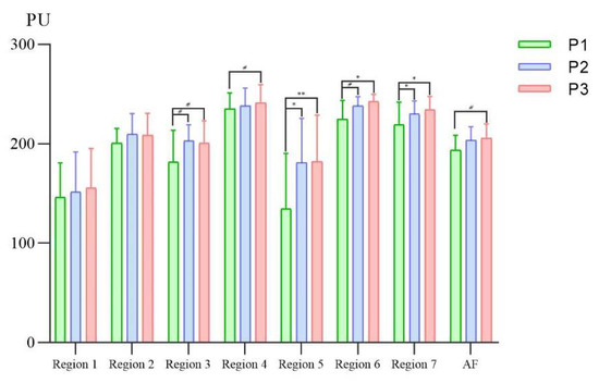 Bar plots of facial skin blood flow of the affected face before and after peripheral magnetic stimulation in stroke patients with facial paralysis. P1, 0–5 min before the PMS intervention; P2, 0–5 min after the PMS intervention; P3, 6–10 min after the PMS intervention; AF, the affected face; PU, perfusion index. #, 0.05 < p < 0.1; *, 0.01 < p < 0.05; **, p < 0.01.