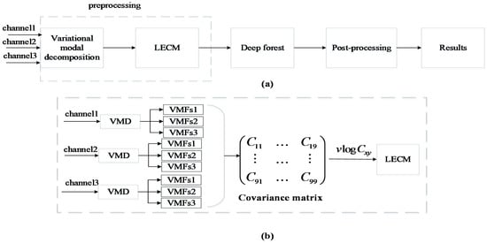 Block diagram of this automatic seizure detection algorithm. (a) The complete flow of the whole system, including preprocessing, classification, and postprocessing. (b) The process of preprocessing in detail, including VMD and the calculation of LECM, where represents the logarithmic half-vectorization operation.