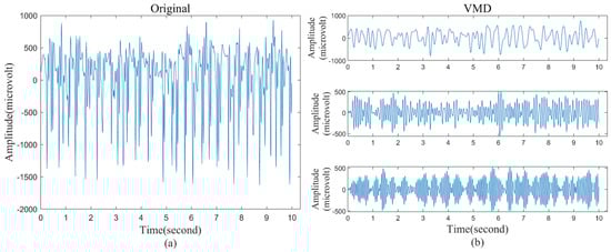 Due to the good robustness and adaptability, variational modal decomposition (VMD) can better analyze and handle nonlinear and nonstationary signals such as EEG, which adaptively decompose the original signal, f(t), into non-recursive modes . Each mode is called a variational mode function (VMF) and can be expressed as Equation (1) []:
