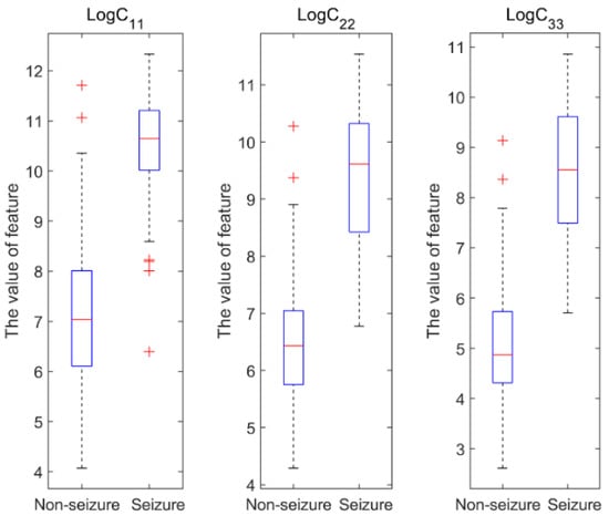 In this work, the variational modal functions (VMFs) of the VMD decomposition were used to construct the EEG time–frequency distribution matrix and calculate its covariance matrix, C. Then, we extracted a vectorized LECM to characterize the EEG signals. As illustrated in Figure 3, the boxplots of the diagonal elements of the LECM were analyzed to compare the distributions of seizure and nonseizure EEG data in the Bonn dataset, which shows that the two types of EEG data are significantly different.