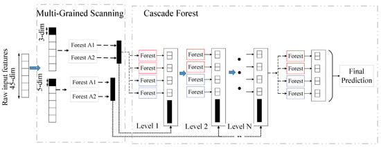 Deep forest is an extension and deep model of random forest, which combines the idea of deep learning based on random forest. Deep forests learn how deep neural networks handle feature relationships, but unlike deep neural networks, deep forests do not have many hyperparameters, and deep forests also perform well on small sample datasets []. Figure 4 depicts the overall framework of deep forest. The sliding window of multigranularity scanning is used to extract the original features and enhance the correlation between the features. The sequences obtained by scanning processing are used as the input of Forest A1 and Forest A2, and the corresponding class probability of each input is obtained by the forest. The results of the forest output are concatenated as the input of the cascade forest.