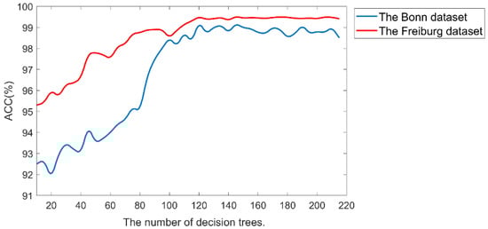The deep forest is a model based on RF and combined with the layer structure of deep learning. We all know that decision trees are the core of RF, and the number of trees is an important parameter in RF, which affects the performance of classification. Too many trees can increase the computational burden. To clarify the appropriate number of decision trees in the deep forest model, we analyzed the results of the EEG classification by performing 10−fold cross−validation experiments with different numbers of trees in the Bonn and Freiburg datasets. Figure 5 provides the relationship between the number of decision trees and the classification accuracy for the two datasets. Among them, the Freiburg EEG database is a long-term EEG dataset, and the seizure duration of each patient is very short, much smaller than the nonseizure EEG data. Therefore, 10−fold cross−validation is not well-suited for the entire EEG dataset. Therefore, we randomly chose 10 patients from the 21 patients and performed a cross-validation experiment combining all seizure data of these patients with randomly selected nonseizure data of the same length. As can be seen in the Figure 5, at first the classification accuracy was effectively improved as the number of trees increased. When the number of trees was below the range of 100, the accuracy improved very rapidly, but when the number of trees increased to 120, the classification accuracy stabilized and did not change significantly. Hence, we set the number of trees to 120 to save computational costs while ensuring good classification performance.