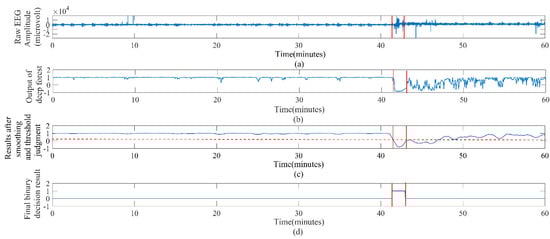 Example of successful seizure event detection with completed postprocessing technique for patient 20. (a) One hour of raw EEG signals. (b) The output of the deep forest classifier. (c) The results after the smoothing operation and the threshold judgment. The horizontal red dotted line is the threshold. (d) The final binary classification results after the adaptive collar technology, where the period between the two red vertical lines is the epileptic seizure period marked by the expert.