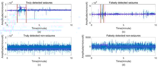 Four EEG time series with different judgment results of this seizure detection system. (a) Truly detected seizures; (b) falsely detected seizures; (c) truly detected nonseizures; (d) falsely detected nonseizures. The seizures identified by the experts are represented between the vertical red lines, and the purple horizontal line represents the binary decision result of our algorithm.