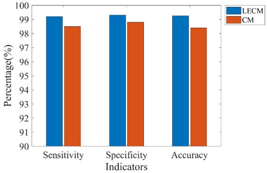 Among them, TP represents the number of seizures correctly detected by the algorithm, FN is the number of seizures incorrectly determined by the algorithm to be nonseizures, TN indicates the number of nonseizures correctly detected by the algorithm, and FP is the number of nonseizures incorrectly determined by the algorithm to be seizures. Thus, sensitivity is applied to evaluate the ability of our algorithm to classify seizure EEG data, while specificity can evaluate the ability to classify nonseizure EEG data. For the imbalance in seizure and nonseizure data in the Freiburg dataset, G−mean can be a good evaluation of the algorithm’s classification effect on two different types of data.