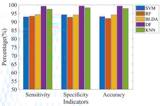 Deep forest is a tree-based deep neural network model. To verify its performance, we used support vector machine (SVM), random forest (RF), Bayesian linear discriminant analysis (BLDA), and K−nearest neighbor (KNN) to compare with the deep forest model under the same input. Among them, BLDA adopts a regularization method to avoid overfitting in high-dimensional data and noisy data and does not need manual parameter tuning. We only set the average value of the BLDA output as the final classification threshold. RF builds multiple decision trees and uses them to vote for classification results. The number of decision trees in the RF is the same as the number selected in the deep forest model. The core idea of SVM is to find the best hyperplane between samples with different attributes to classify the data. Here, we used the Gaussian function and applied the transformation technique to determine the hyperparameters. During the testing process of KNN, the method determines the class of the sample based on the class of one or several recent samples. In this experiment, the number, K, of adjacent classes was taken to be 5.