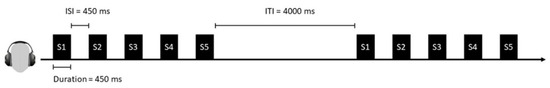 A short-term habituation paradigm was employed to acquire decreased N1 responses. A stimulus was programmed to be repeatedly presented in trains, each of which held five presentation positions (S1 to S5), which were separated with a constant inter-stimulus interval (ISI) for 450 ms. Given an inter-train interval (ITI) for 4 s with a 200 ms jitter, the electrophysiological response to a spoken word-form could be expected to recover from the short-term habituation of N1 in the previous train, according to many previous studies [12,18,25]. Figure 1 presents how two trains are delivered in the current design.
