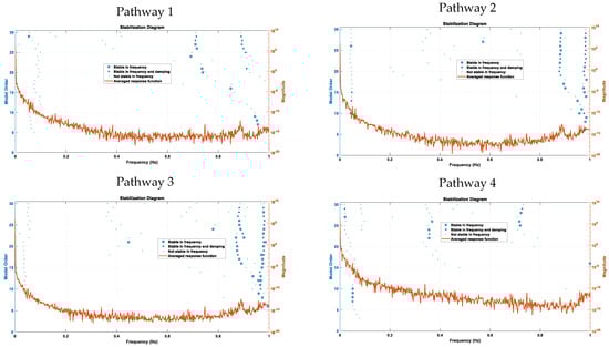 9]). The input and output time series were stored using a time-domain data object (“iddata” in MATLAB, MathWorks, Inc., Natick, MA, USA). We excluded the initial 50 s of the transient response in the time-series data for modal analysis. We used the modal analysis functions “modalfrf” to determine frequency-response functions for modal analysis, “modalfit” to determine modal parameters from the frequency-response functions, and “modalsd” to generate a stabilization diagram for modal analysis of the data object in MATLAB (MathWorks, Inc., Natick, MA, USA). First, the frequency-response functions for the four tES pathways of the NVU system were found using “modalfrf” for a sample rate of 10 samples per second (10 Hz), where the noise was assumed to be uncorrelated with the input signals. Then, the natural frequencies of the four tES pathways for the NVU system were found from the frequency response using the “peak-picking” method (a fast and straightforward procedure for identifying peaks in the frequency-response functions) available in the “modalfit” function in the physiological frequency range of 0.01–0.2 Hz. Then, a single set of modal parameters was generated using the least-squares complex exponential (LSCE) algorithm by analyzing multiple response signals simultaneously in “modalsd”. Here, a stabilization diagram was used to identify the physical modes by examining the stability of the poles as the number of modes increased. Then, the linear model of the four physiologically detailed tES pathways in the NVU was found using the Model Linearizer tool in the Simulink (MathWorks, Inc., Natick, MA, USA) linear analysis package. The damping ratio, the natural frequency, and the time constant of the poles were obtained using the “damp” function from the linear model system.