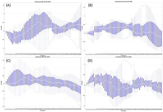 Granger causality and block exogeneity tests for vector autoregression (VAR) models were conducted using MATLAB (MathWorks, Inc., Natick, MA, USA) to check whether the tDCS waveform was block exogenous, i.e., the tDCS waveform does not Granger-cause changes in pupil diameter (pupil dilation) and blood volume (HbT) in the multivariate system. First, the time-series analysis of the tDCS-evoked changes in pupil diameter (pupil dilation) and blood volume (HbT) showed that the autocorrelation function decreased slowly, while the partial autocorrelation function converged to zero after about eight lags. An augmented Dickey–Fuller test (“adftest” in MATLAB) confirmed that all signals were stationary (