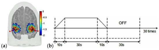 62]. The subjects were seated comfortably indoors in a windowless room while they looked at an evenly painted non-glossy white wall with fluorescent lighting (intensity ~4000 lux). The eyes were monitored using the open-source platform Pupil Core (Pupil Labs, Berlin, Germany). Then, 2 mA tDCS was applied in a 30 s ON–30 s OFF temporal sequence with 10 s ramp-up/10 s ramp-down, which was repeated 30 times in a block design [