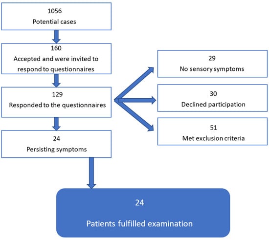 We examined 24 patients (50% of whom were electricians) with persisting sensory symptoms following a work-related electrical accident (Figure 1). Using reports from the AFA insurance company (Stockholm, Sweden) between 2014 and 2019, we identified 1056 victims of electrical accidents in Sweden who suffered an electrical accident between one and six years ago (median three years). The AFA insurance company first asked for willingness to participate in the study. Only those who agreed went to the next step: a full questionnaire e-mail via Smart-trial© (Copenhagen, Denmark). Across Sweden, 160 individuals were sent the full questionnaire and in cases of no response, received a reminder after two weeks.