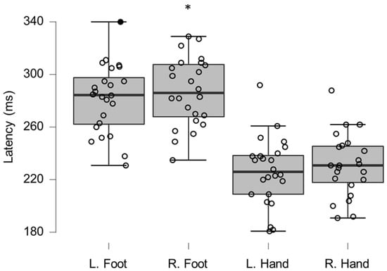LEP latencies in milliseconds for evoked potentials on left and right back of the hand or top of the foot. Reference material derived from in-house healthy subject normative data. * indicates a statistically significant differences to reference material with p-values corresponding to Bonferroni corrected 0.05.