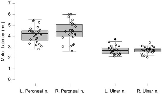 Box-plots for motor neurography latencies. For box plots summary and explanation of symbols, see Figure 2.
