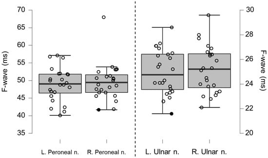Box-plots for motor neurography F-wave latencies. Filled circles represent values ≥ two standard deviations outside reference values.
