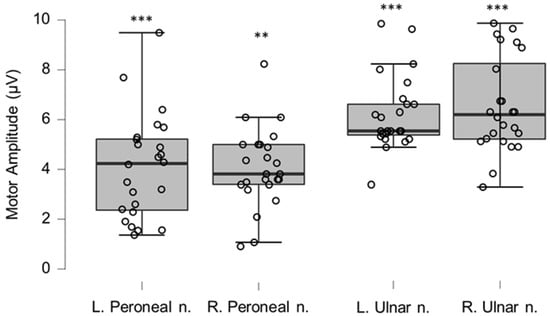 Motor neurography amplitudes for left and right peroneal and ulnar nerve. ** and *** indicate statistically significant differences to reference material with p-values corresponding to Bonferroni corrected 0.01, and 0.001, respectively.
