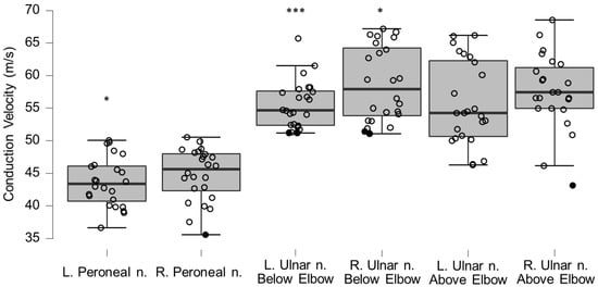 Motor neurography conduction velocities (CV) for left and right peroneal and ulnar nerves. * and *** indicate statistically significant differences to reference material with p-values corresponding to Bonferroni corrected 0.05 and 0.001, respectively.
