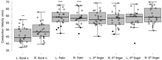 Box-plots for sensory neurography conduction velocities. Lower and upper box boundaries represent the 25th and 75th percentiles, respectively. The line inside the box represents the median and the lower and upper whiskers represent the 10th and 90th percentiles. Filled circles represent values ≥ two standard deviations outside reference values. ** and *** indicate statistically significantly lower median values compared to the reference material, with Bonferroni-corrected p-values corresponding to 0.01 and 0.001, respectively.