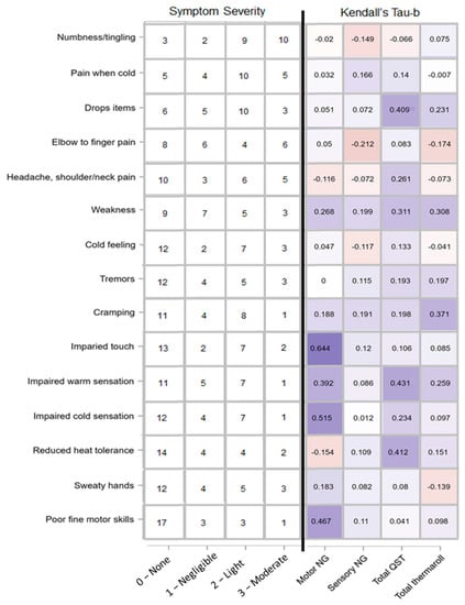 Reported symptom severity and correlation with amount of clinically relevant cases per test paradigm. Left: self-reported, ranked (most prevalent at the top, least at the bottom) symptoms severity adapted from the HAVS questionnaire. Numbers represent number of patients who chose a given intensity option ranging from none to moderate. Right: heatmap of Kendall tau-b correlations representing patients’ self-reported symptoms and amount of clinically relevant cases for test paradigms motor NG (motor neurography), sensory NG, total QST (quantitative sensory testing), and total temperature roller cases.