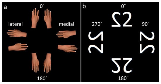 Stimuli used in the (a) MI task (courtesy of []) and (b) VI task at the different orientations. Hand images in the lateral orientation were regarded as stimuli with high biomechanical constraint and those in the medial orientation as low biomechanical constraint.