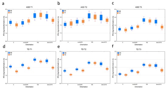 RTs (log-transformed) in separate graphs for the different orientations and tests by the age levels (A1 (a) and (d); A2 (b) and (e); and A3 (c) and (f)) and groups (ASD (a–c) and TD (d–f)). Means are indicated by the lines, standard errors by the box and 95% confidence intervals by the whiskers.