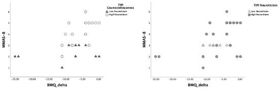 A dichotomous value of I-TIPI Conscientiousness and Neuroticism was used, according to the normative data proposed by Goslin and colleagues [42], to better characterize the differences. Both personality traits showed that, when Conscientiousness and Neuroticism scored low, an increase in ΔBMQ did not change MMAS-8 scores. On the contrary, a direct relationship between beliefs about medications and adherence to medications was typical of subjects with high Conscientiousness and Neuroticism.
