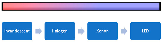 Light sources from high to low heat production. Incandescent lightbulbs produce more heat (red) than LED light sources (blue). LED: light emitting diode. Reprinted/adapted with permission from Ref. [18]. 2022, Erion Junior de Andrade, M.D., M.Sc.