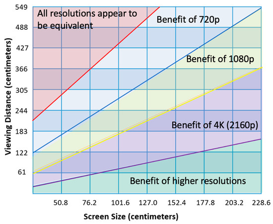 Graph of the ability of the human eye to perceived screen resolution based on screen size (x-axis) and distance from monitor (y-axis). Reprinted/adapted with permission from Ref. [21]. 2022, Carlton Bale, M.S., M.B.A.
